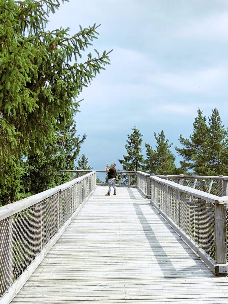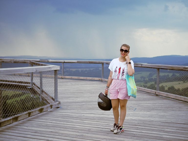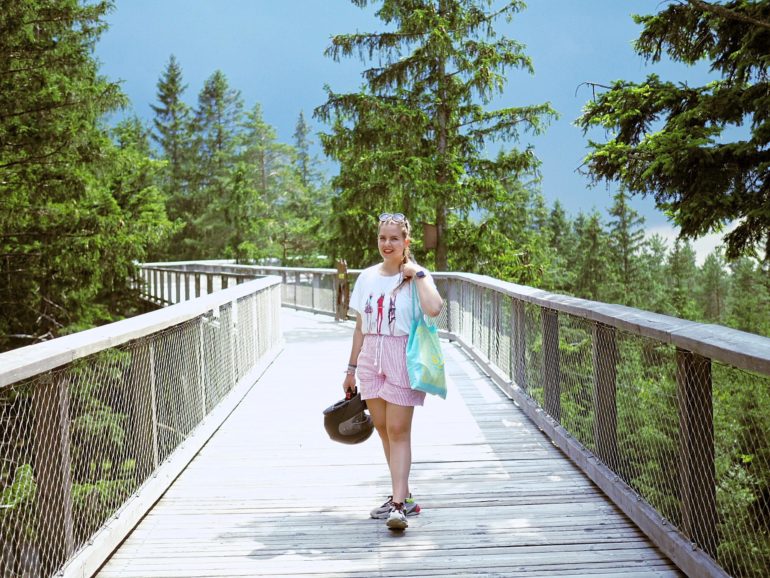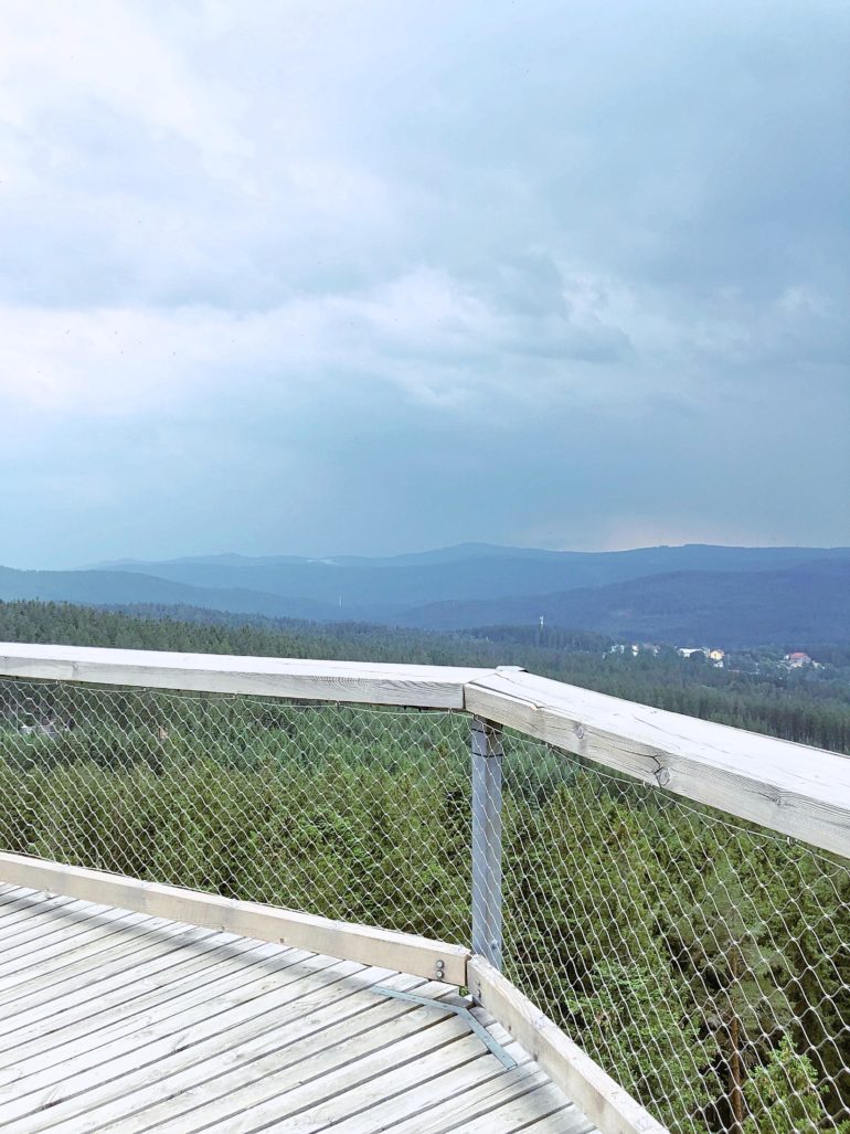 Například na Stezku korunami stromů, která se od Černé v Pošumaví nachází jen devatenáct kilometrů, přímo v Lipně nad Vltavou. Nejenže je z ní nádherný výhled a na stezce se dozvíte i spoustu zajímavých informací nejen o jejím vybudování (Věděli jste, že jedna sirka roste v lese šest hodin?), ale ještě s sebou můžete vzít i děti, kteří si užijí spoustu zábavy na `stezkách odvahy`. Těch je v korunách stromů hned několik. Ze začátku je zvládáte levou zadní, ale postupně přituhuje. Na poslední už jsem se pořádně zapotila. (Ano, rozumíte správně, není to jenom atrakce pro děti, vlastně jsem tam ani žádné děti neviděla, zato dospělých hned několik.) Při troše štěstí budete mít tři sta šedesáti stupňový výhled do okolí. Na Lipno, lesy, lanovku, sjezdovku i do sousedního Rakouska. My ale měli smůlu. Kolem kroužily bouřkové mraky, takže jsme viděli maximálně kus Lipna, sem tam kus zmáčeného lesa a v dálce pořádnou průtrž mračen.